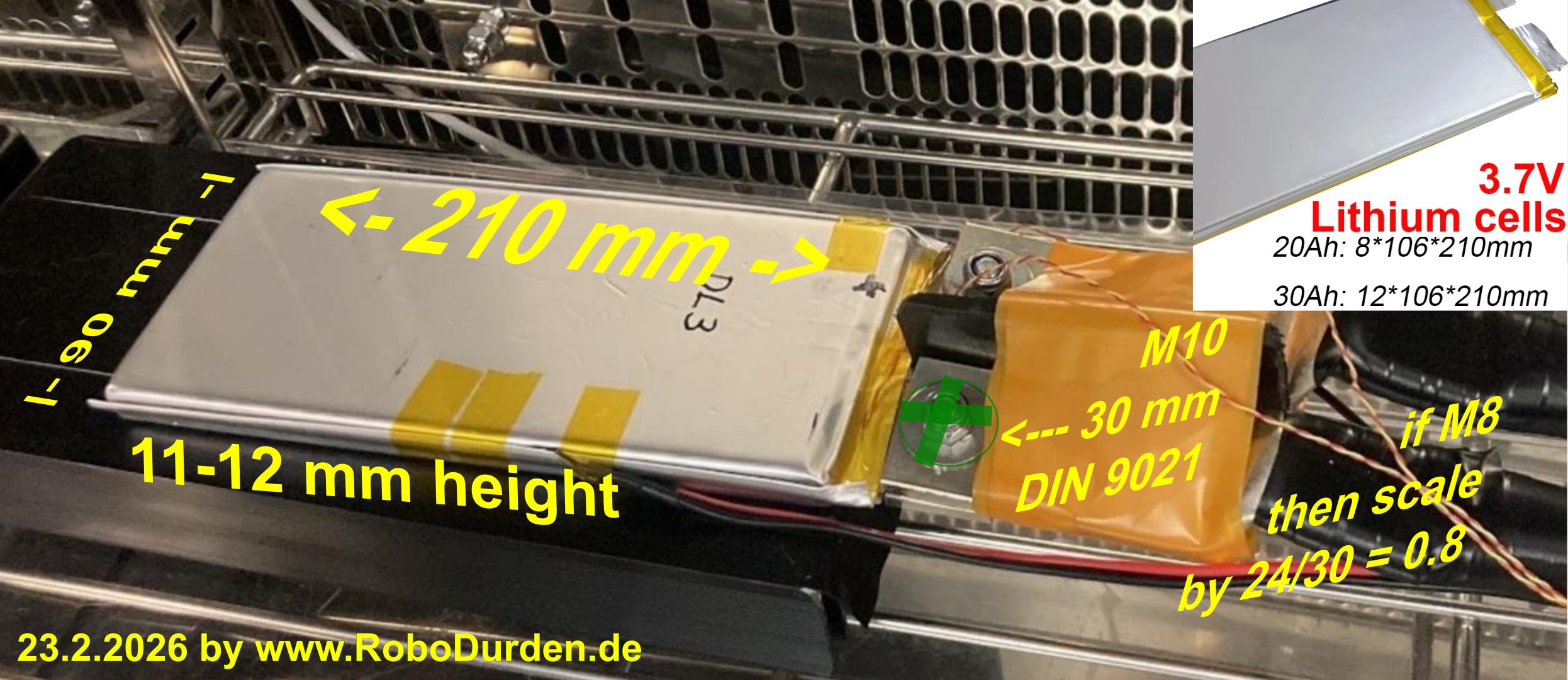 Based on a visual analysis of the test samples (using standard M10 washers as scale), the 26 Ah pouch cell measures approximately 210 x 90 x 11 mm.